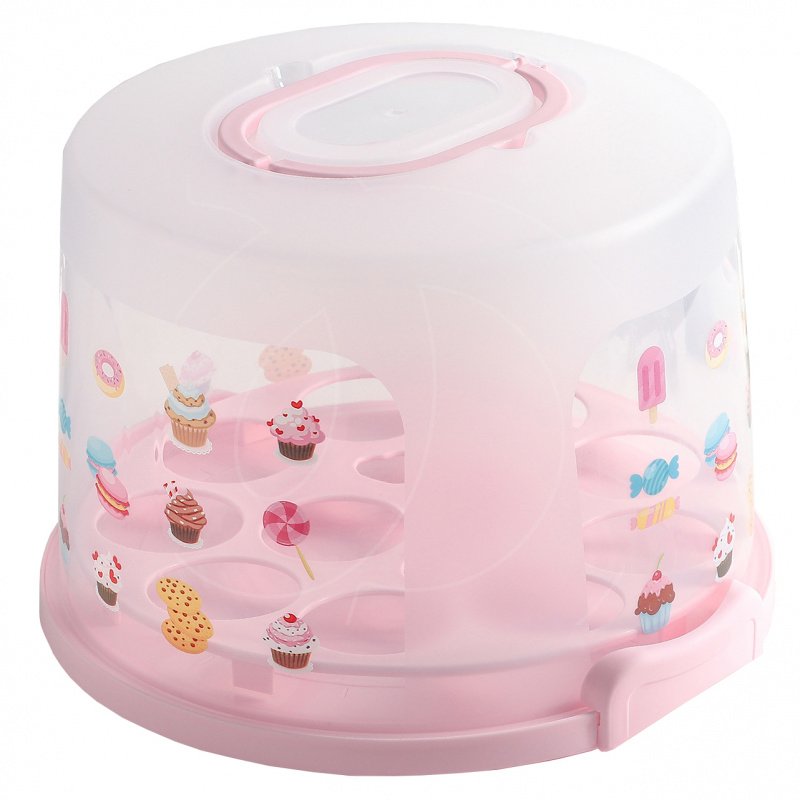 Оснащен дополнительной подставкой с ячейками под пирожные и капкейки - вы можете убрать ее, если в контейнер необходимо поместить торт.