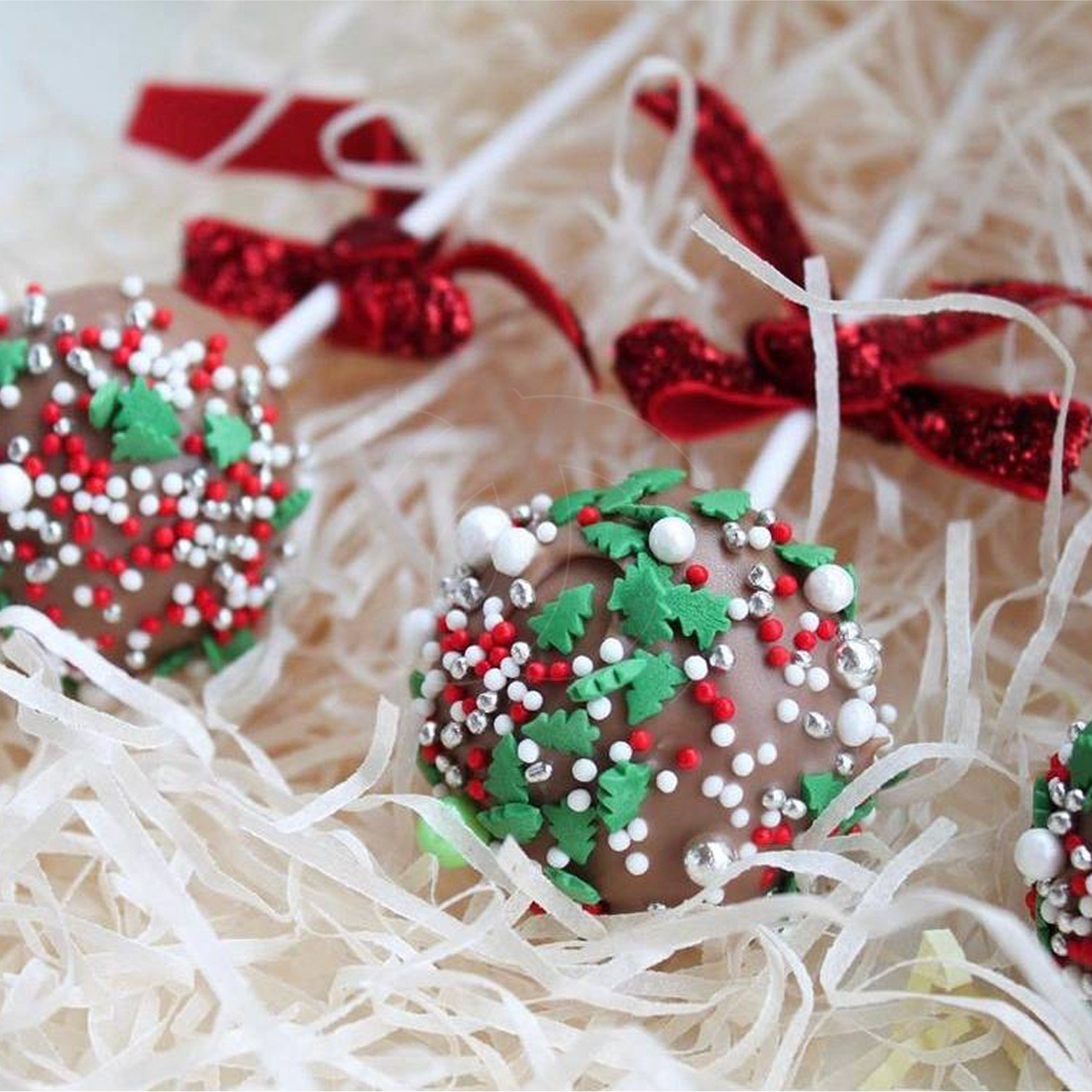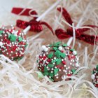 Большие красные и зеленые шарики сахарные, твердые, их нужно либо немного рассосать во рту, либо использовать только как декор.